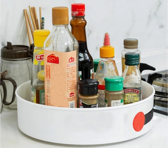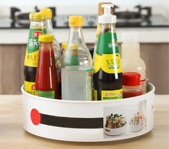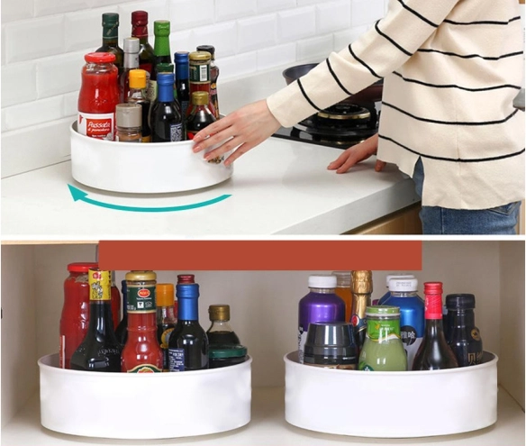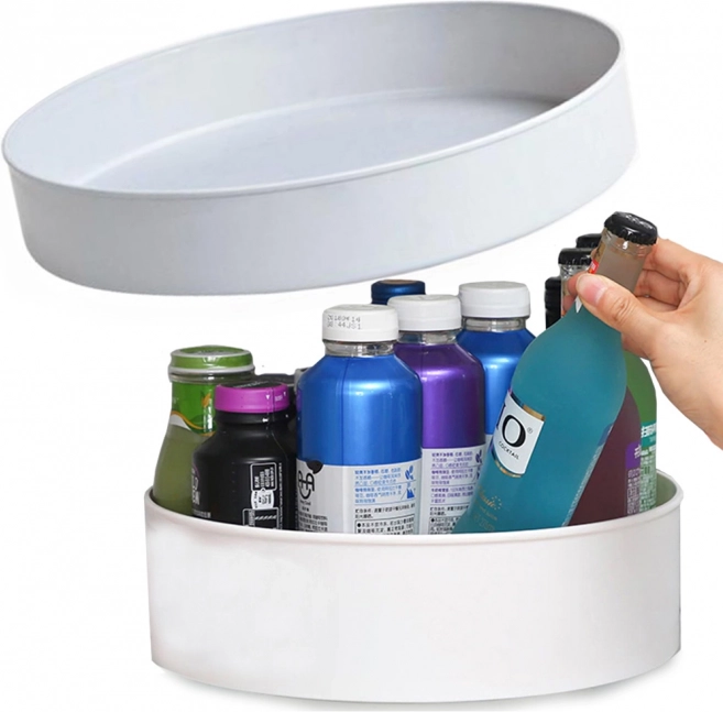 Den universelle drejelige organizer er en ideel hjælper i både køkken og badeværelse. Den kompakte skål med stabil drejebund gør det nemt at finde og tage den ønskede genstand uden at rode rundt. Det minimalistiske design i holdbar plast passer ind i de fleste interiører og hjælper med at bevare renhed og overblik på hylder og bordplader.