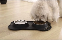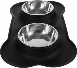 Forkæl dit kæledyr med komfortabel og ren fodring. To skåle i rustfrit stål med kapacitet 2 × 450 ml er indsat i en fleksibel silikonemåtte, som opfanger spildt vand og drysset foder. Den benformede måtte har forhøjet kant og skridsikker overflade, så den bliver liggende, også når der spises ivrigt.