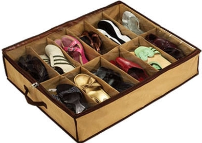 Den lette konstruktion uden afstivning er pladsbesparende, og håndtagene gør den nem at bære. Organisatoren har 12 separate rum til skopar og kan også bruges til legetøj, bælter, sokker eller undertøj. Den neutrale beige farve med brun kant passer ind i enhver indretning.