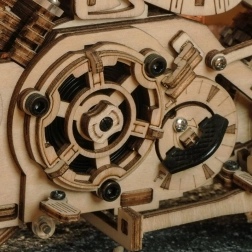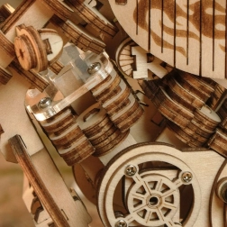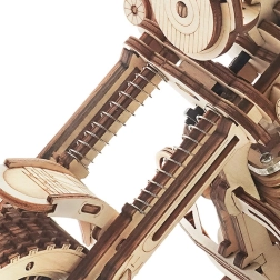 Denne mekaniske motorcykel i træ er et fremragende valg for alle, der elsker design, teknik og solidt håndværk. Den optrækkelige fjeder med aftrækker sætter modellen i rask bevægelse, mens det funktionsdygtige styr muliggør delvis retningskontrol. Den realistiske motorgang fuldendes smukt af stempelbevægelsen og den fungerende affjedring i forgaffelen.