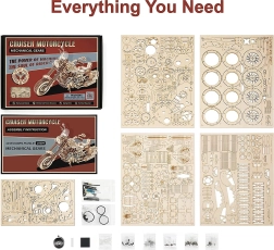 Oplev glæden ved modelbygning med dette præcise 3D-byggesæt af en motorcykel i krydsfiner. Modellen byder på en optrækkelig fjederdrift, funktionsdygtig styring, bevægelige stempler og arbejdende forgaffel-affjedring. Med 420 dele og mellem sværhedsgrad får du 4–5 timers underholdning; efter samling er motorcyklen i stand til at køre selv og imponerer med både dekorativt udseende og små opbevaringsrum ved sædet.