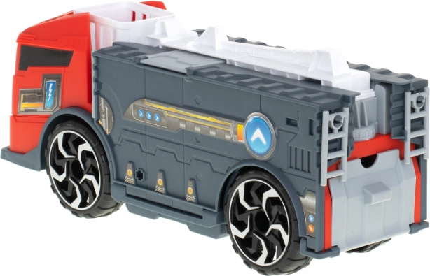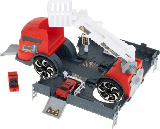 Brandbilen fungerer som en transporter, der transporterer de medfølgende modelbiler ved hjælp af en rampe.