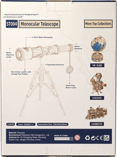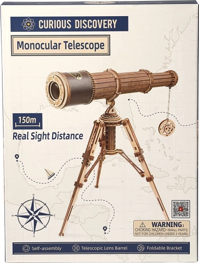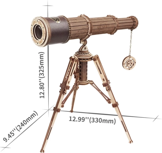 Oplev magien ved konstruktion med 3D træmodelen af et monokulært teleskop fra ROBOTIME Rokr. Denne smukt dekorerede kikkert tilbyder tredobbelt forstørrelse og en reel synsafstand op til 150 meter, hvilket gør den til et ideelt både dekorativt og funktionelt element.