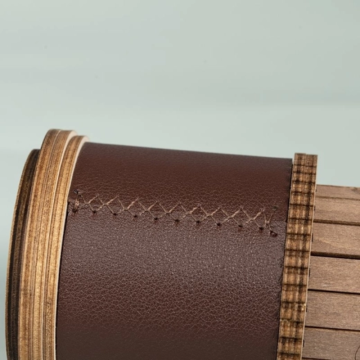 Trætubus med læderbånd og metalmærkat tilføjer modellen et vintage udseende, der pynter ethvert interiør.