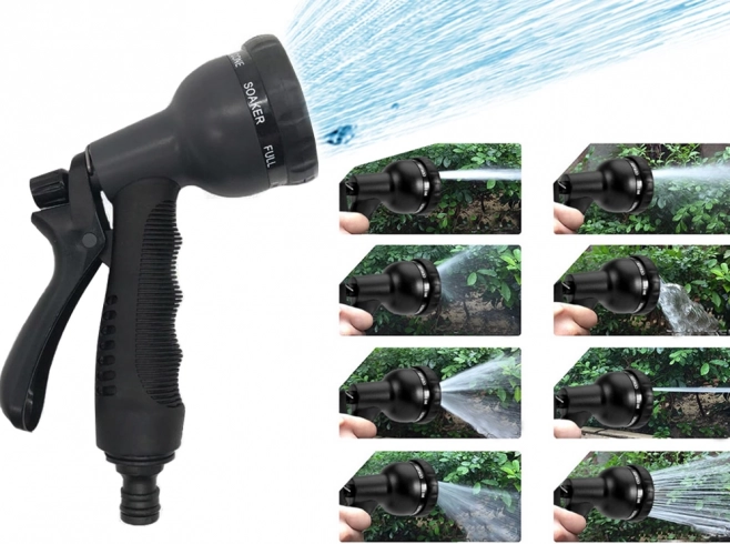 Spraypistolen tilbyder otte forskellige tilstande og er udstyret med en låsemekanisme for komfort under vanding.