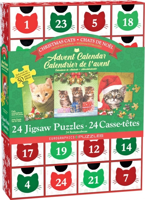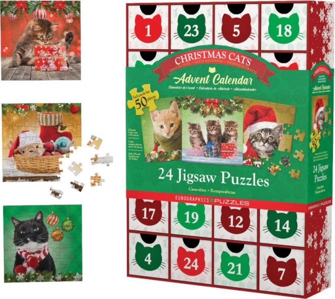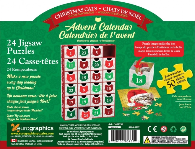 EUROGRAPHICS adventskalender med 24 mini-puslespil Julekatte. Hvert puslespil har 50 brikker, 12,5 × 12,5 cm. Genanvendelige skuffer med skabeloner.