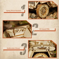 Nyd at samle den detaljerede model af en militær jeep, som bringer timer med kreativ underholdning. Den sammensatte model uden behov for lim tilbyder følgende funktioner: