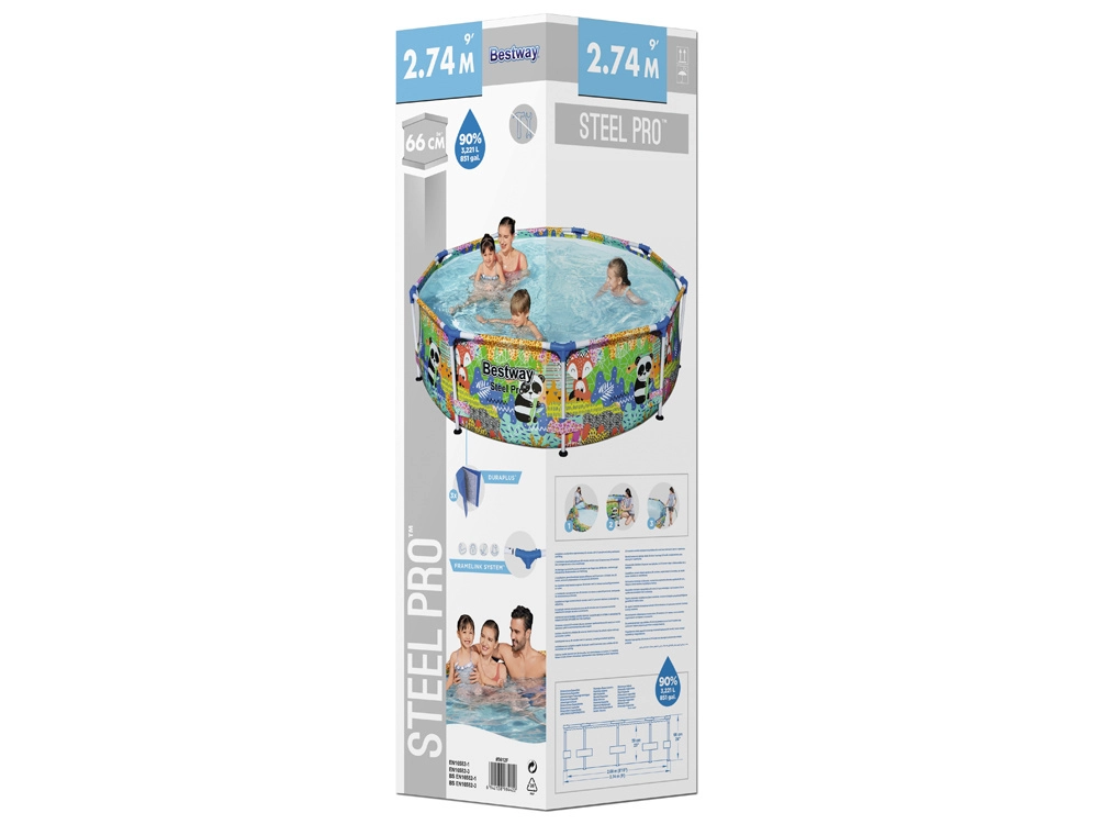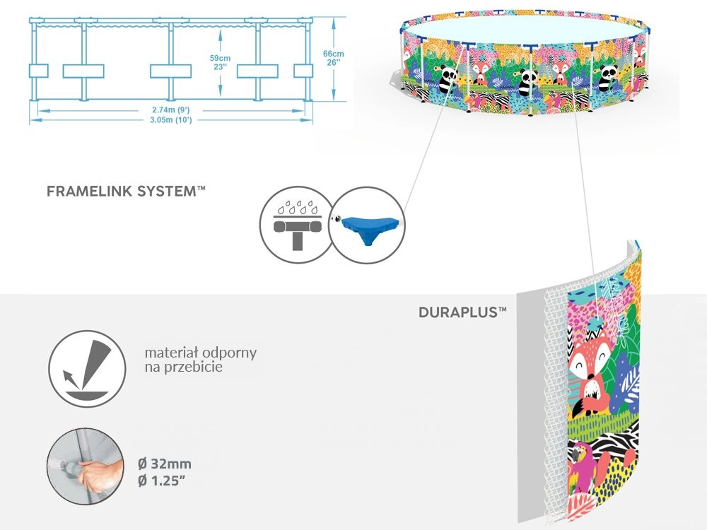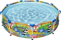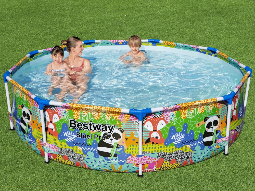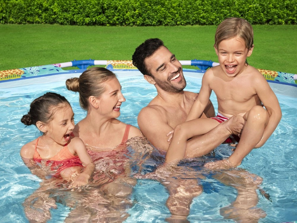 Det ideelle valg til mindre haver, gårdhaver eller terrasser: den runde ramme-pool fra BESTWAY med nem montering giver forfriskning og masser af sjov for både børn og forældre. Den stabile stålramme og de kvalitetsbløde sider med glad dyregrafik skaber et sikkert miljø til vandleg.