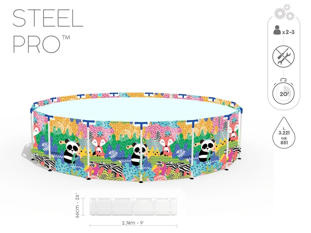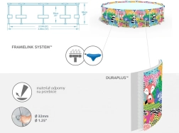 Steel Pro-teknologien med FrameLink System minimerer korrosion i metalforbindelser, mens det trelags DuraPlus-materiale (polyester-net mellem to stærke PVC-lag) øger modstanden mod rivning og slid. Takket være den integrerede aftapningsventil og tilslutninger til FlowClear er vedligeholdelsen af poolen enkel og hurtig.