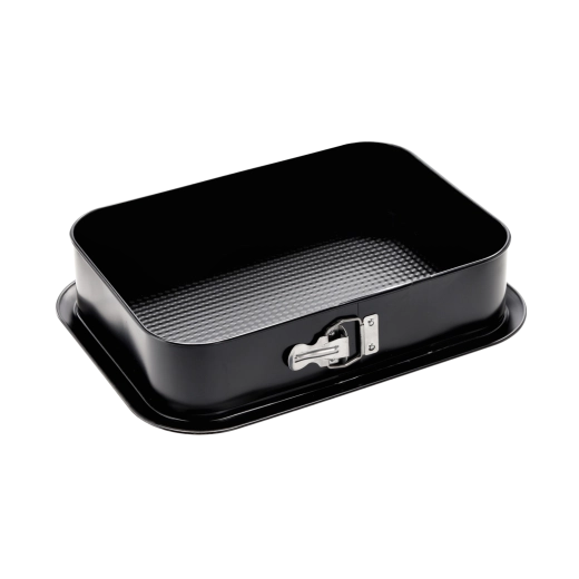 Praktisk rektangulær springform med aftagelig kant og non‑stick belægning for nem frigørelse af bunde og kølede desserter. Sort udførelse, solid stål og pålidelig låsemekanisme til bekvem bagning i både gas- og elovne.