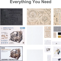 ROKR Marble Night City er en fantastisk 3D samlermodel af en kuglebane, der kombinerer sjov og læring. Denne model består af 294 præcist udskårne dele, der danner en kompleks bane med forskellige forhindringer og hånddrevet mekanik ved at dreje et håndtag. Pakken indeholder en komplet manual, der guider dig gennem samlingsprocessen.