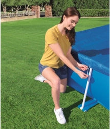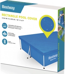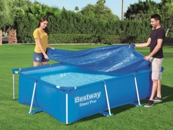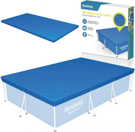 Dækket er designet til at beskytte din rektangulære pool med en ramme på 300 x 201 cm. Specielle afløbshuller på dækket forhindrer vandophobning. Takket være integrerede stropper kan dækket nemt og sikkert fastgøres til poolstrukturen.