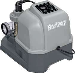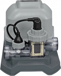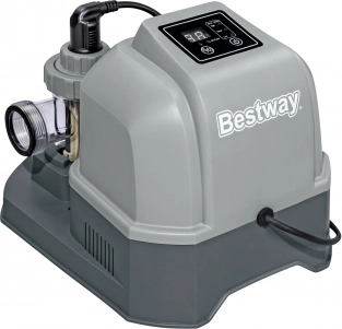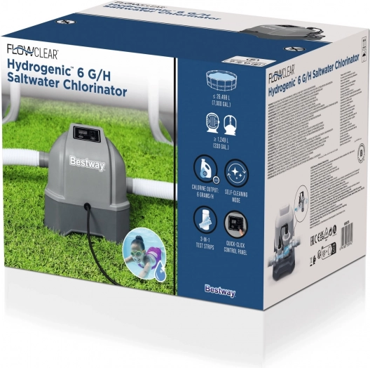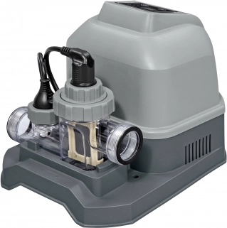 | Apparat til rensning af vand i pools, som er egnet til alle typer vandkilder. | - kompatibel med pools op til 7000 gal (26.498 l) og kræver en minimumsflow på 330 gal (1.249 l), - bruger salt til at producere klor, som holder poolen ren og samtidig er skånsom mod hud, øjne og hår, - letbetjent kontrolpanel med automatisk låsefunktion, - automatisk selvrensende tilstand, - indeholder adaptere til de fleste pools, - indeholder 50 teststrimler, - klorudgang 6 g/t. | .
