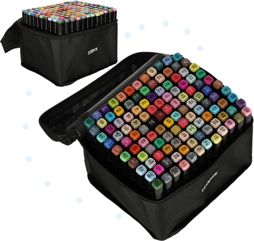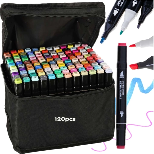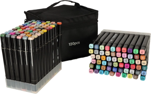 Opdag et sæt med 120 dobbeltendede alkoholmarkere i et praktisk etui og med en plastiksokkel. Hver tusch har en bred og fin spids til farvelægning og præcise linjer. Alkoholbaseret blæk blender flot, tørrer hurtigt og er farveægte – ideel til skitser, illustration, lettering og design.