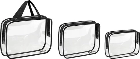 Praktisk sæt med tre gennemsigtige kosmetiktasker i størrelserne S/M/L til perfekt organisering på rejser og derhjemme. Fremstillet af holdbart BPA-frit PVC, de er vandafvisende, nemme at rengøre, og takket være det transparente design ser du indholdet med det samme. Den største taske har et solidt håndtag og kan også bruges som en lille strand- eller træningstaske.