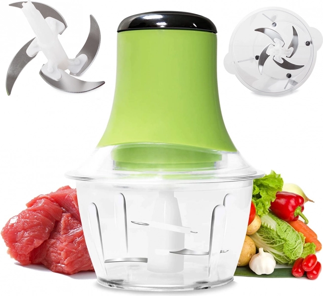 Den elektriske frugt- og grøntsagsskærer er meget let at bruge. Indsæt blot de nødvendige ingredienser i beholderen, tilslut den til strømmen og tryk på knappen øverst på enheden for at starte hakkeren.
