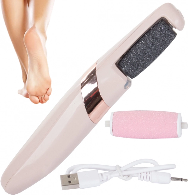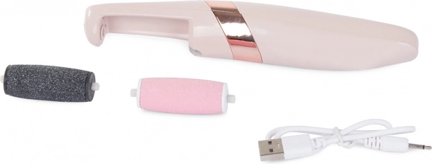 I pakken finder du også et udglattende hoved og et USB-opladningskabel, hvilket gør denne fil til en praktisk ledsager til din daglige fodpleje.