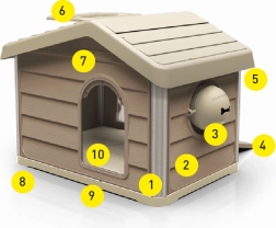 Det modulære system med 6 hoveddele muliggør nem montering og demontering uden værktøj, hvilket gør huset ideelt til have, terrasse og transport. Den interaktive dispenser til tørfoder fremmer langsommere og sundere spisning og stimulerer hundens eller kattens naturlige instinkter på en underholdende måde.