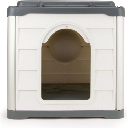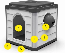 Takket være det modulære system består det af 6 hoveddele: væg med indgang, væg med foderdispenser, to fulde vægge samt to gulv-/tagdele med drænriller for nem rengøring. Samlingen er hurtig, uden værktøj, hvilket gør huset ideelt til hjemmebrug og rejser.