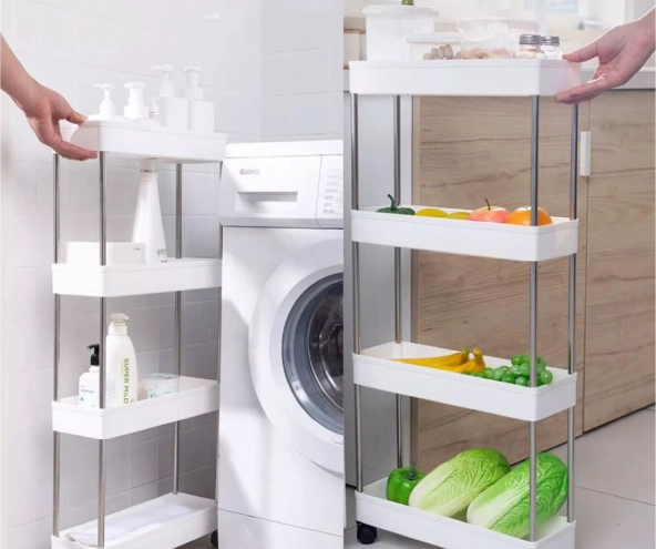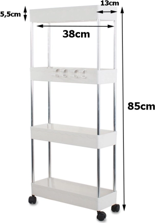Skabet er designet til effektiv rummanipulation i dit hjem. De fire hylder tilbyder rigelig opbevaringsplads til toiletartikler på badeværelset eller madvarer i køkkenet. Takket være hjulene er det let at flytte og multifunktionelt, så du kan tilpasse det til dine egne behov.