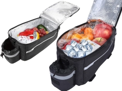 Alsidig termotaske til cykel til montering på bagagebæreren – ideel til daglig pendling og længere ture. Det termisk isolerede hovedrum opbevarer sikkert mad, drikke eller tøj, mens mindre lommer rummer småting som nøgler, pung eller en vandflaske. En reflekterende stribe rundt om øger synligheden i skumring og mørke.