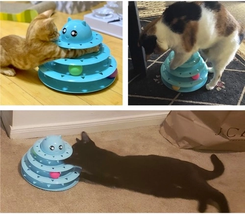 Systemet med tre niveauer og bevægelige bolde giver katte fysisk aktivitet og mental stimulering.