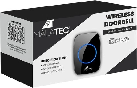 Trådløs dørklokke Malatec er en moderne enhed, der giver dig pålidelig besked om besøgende takket være rækkevidden på op til 300 meter. Den har et elegant sort design og er lavet af holdbart ABS-plast. Med sin vandtætte behandling (IP44) er den i stand til at modstå både regn og sne.