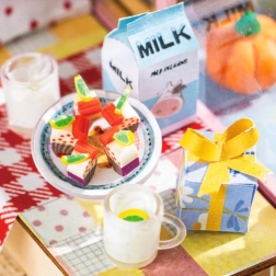 Oplev magien i detaljerede miniaturer med DIY-byggesættet ROBOTIME Holiday Party Time. Byg en sød, pastelbutik med balloner, blomster og hyggelig LED-belysning. Sættet indeholder alt, hvad du skal bruge til at samle – lim, maling, pensel og små værktøjer. Ideelt til kreativ afslapning, som interiørdekoration og en smuk gave til 14+ .