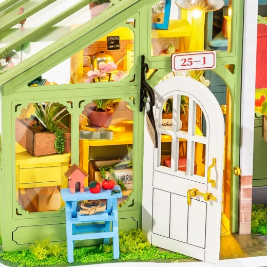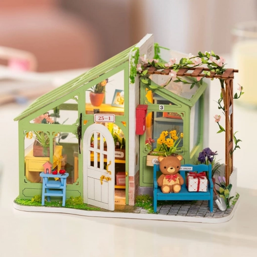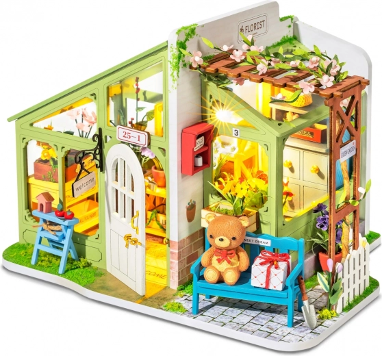 Oplev magien ved en mini-verden med den kreative byggesæt ROBOTIME – en detaljeret blomsterbutik, som du bygger selv. Denne dekorative miniature med LED-belysning skaber en hyggelig atmosfære, rige blomsterdetaljer og timer med afslappende hygge under kreeringen. I pakken finder du alt, hvad du behøver, inklusive lim, maling og pensel, så du kan gå i gang med det samme.