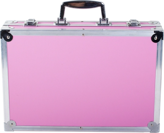 Kuffert i lyserød med metalhjørner giver robust beskyttelse og nem transport takket være håndtaget.