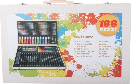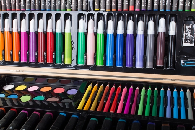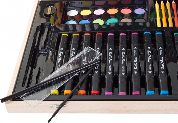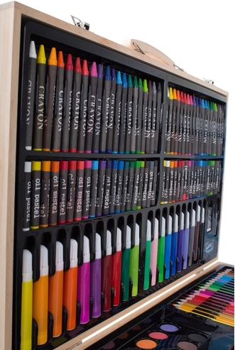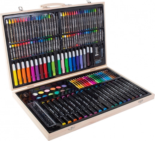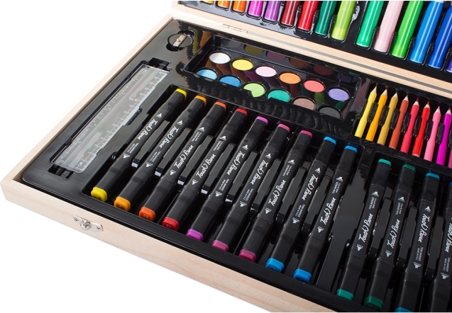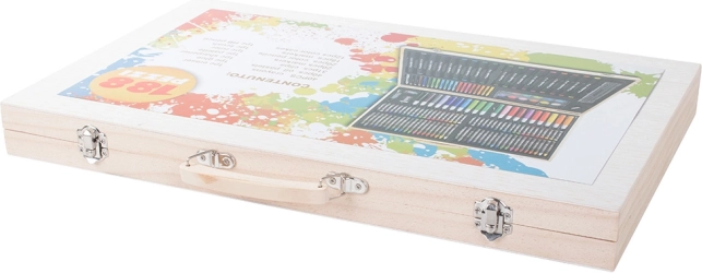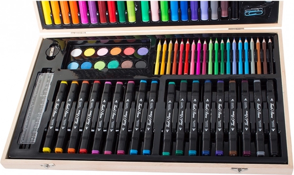 Sættet er omhyggeligt arrangeret i et holdbart træetui, der sikrer nem bærbarhed og organisering. Hvert værktøj har sin plads, hvilket betyder, at du aldrig mister din yndlingsfarveblyant. Når kunstværket er færdigt, opbevarer du det hele nemt i etuiet.