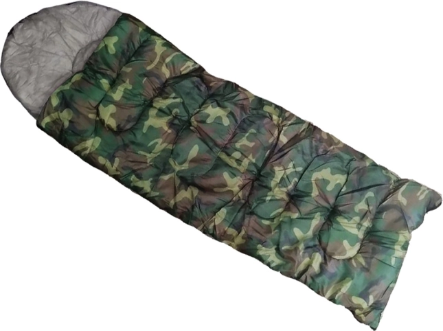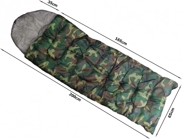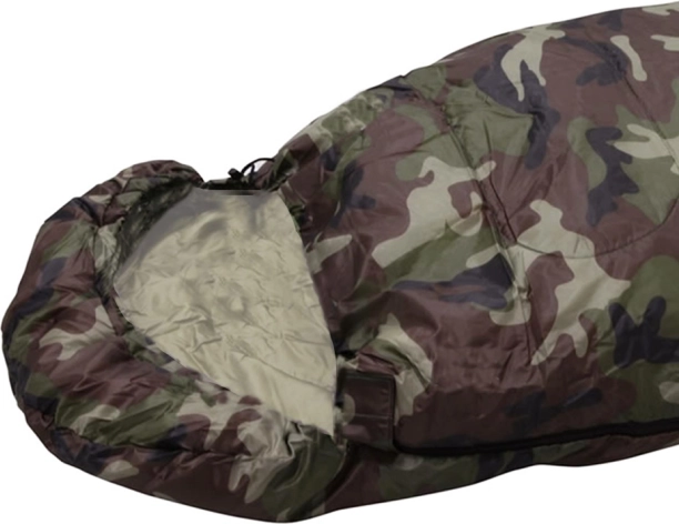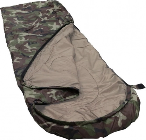 Enkeltpersoners sovepose i camouflage-design til camping og vandring. Har lynlås i fuld længde, integreret hætte med snøre og en let, slidstærk konstruktion med polyesterisolering, som effektivt holder på varmen. Kan lynes helt op og bruges som tæppe.