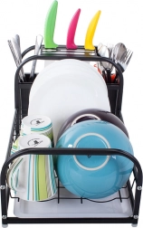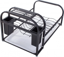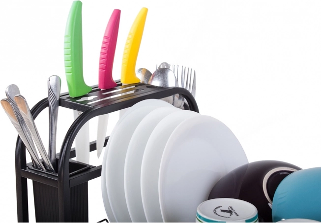 Opvaskestativet rummer alt, hvad du skal tørre efter opvasken: det har en vertikal sektion til tallerkener (op til 5 stk.), plads til skåle, krus og glas, og der medfølger to rum til bestik samt en knivholder for sikker og overskuelig tørring. Plastbakken opfanger vanddråber pålideligt, så bordpladen forbliver tør og uden pletter.