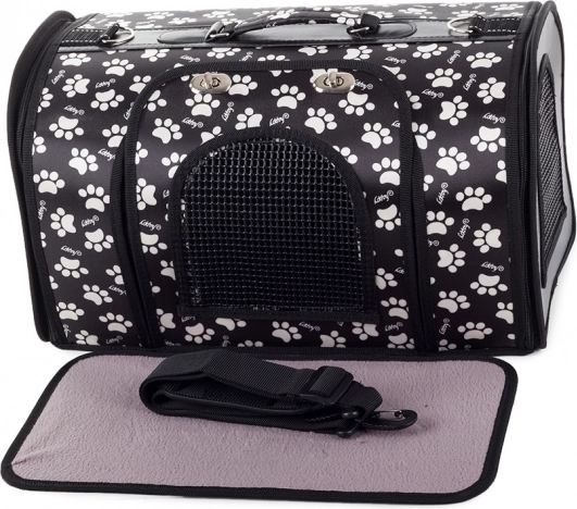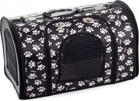 Denne elegante sorte taske er ideel til rejser med bus, tog og til dyrlægen. Takket være tre lynlåsåbninger (to i siderne og én foran) samt metal-låsning af hovedåbningen sikrer den nem håndtering og større sikkerhed for dit kæledyr. Det integrerede ventilationssystem med mesh giver rigeligt frisk luft og godt overblik over dyret.