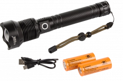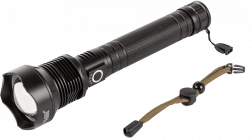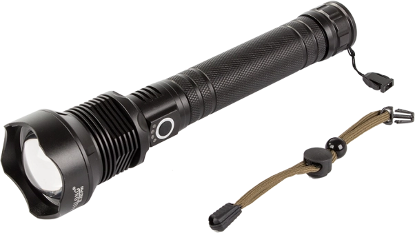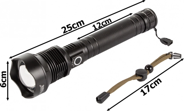 Med en glidende zoom funktion kan man let justere lys keglebredden og rækkevidden op til 1000 m, hvilket øger dens anvendelsesfleksibilitet. Den er drevet af moderne genopladelige batterier for forlænget driftstid.