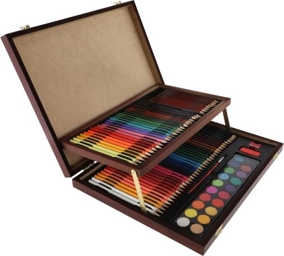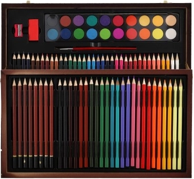 Opdag komplet kunstudstyr, ideel til både små og store kunstnere. Dette praktiske sæt i en elegant trækuffert tilbyder alt nødvendigt til maleri og tegning, inklusive farveblyanter, blyantspidser, viskelæder og vandfarver, i alt 91 dele.