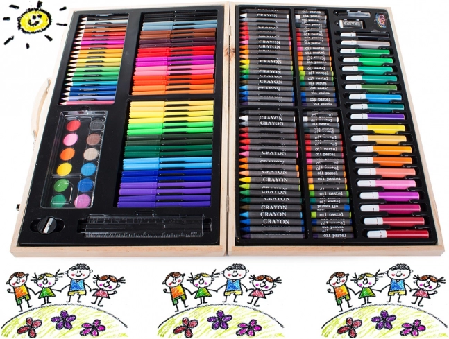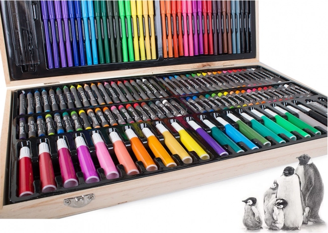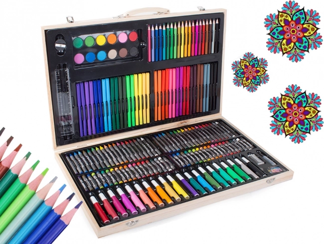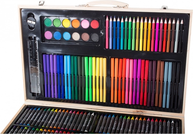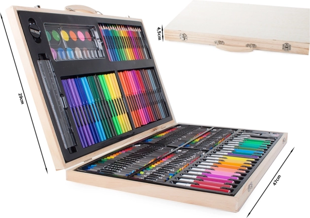 Komplet kreativsæt i et elegant træetui til både børn og voksne med op til 180 dele til tegning og maling. Takket være det praktiske etui med håndtag har du alt overskueligt samlet ét sted og nemt at tage med. Ideelt til at udvikle kreativiteten, øve forskellige teknikker og skabe i det uendelige derhjemme, i skolen og på farten.