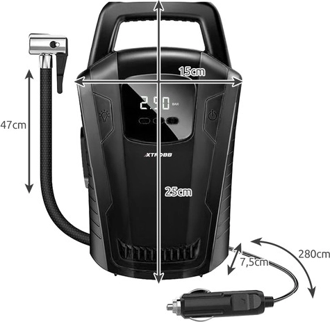 Pakken indeholder 3 universelle dyser og ekstra sikringer, så du ud over bil- og motorcykeldæk nemt kan pumpe bolde, madrasser, både og pools. Kompressoren har en lang 2,8 m strømkabel (DC 12V) og en 47 cm trykslange med klemmeende, der sikrer en hurtig og solid tilslutning til ventilen.