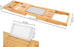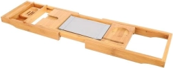 Skab spa-stemning derhjemme. Den udtrækkelige bambusbakke hviler sikkert på karkanterne og holder alt nødvendigt inden for rækkevidde – fra telefon og bog til drikkevarer og kosmetik. Takket være justerbar længde på 75–112 cm passer den til de fleste badekar.