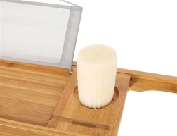 Den praktiske inddeling byder på holder til tablet/bog med metalstøtte og 3 positioner, en dedikeret åbning til vinglas, aftagelig sæbeskål samt indsats til håndklæde, plus en niche til lys eller duft. Bambustræ er naturligt modstandsdygtigt over for fugt, let at vedligeholde og ser elegant ud på badeværelset.