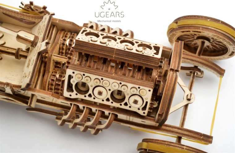 Oplev magien ved de første racerbiler med den detaljerede model UGEARS U9 Grand Prix. Denne træmekaniske model med optræksdrev tilbyder en fungerende gearkasse (tomgang og bakgear), styring, affjedret foraksel og gummibelagte dæk for bedre greb. Med den synlige V8-motor med bevægelige stempler og køleventilator giver den en fascinerende oplevelse både under kørsel og på hylden.