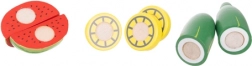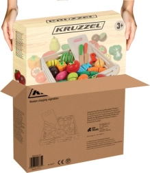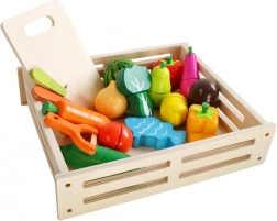 Et farverigt træ-sæt med frugt og grøntsager i en praktisk kasse tilbyder realistisk leg som køkken, butik og madlavning. Delene “skæres” nemt takket være velcro og sættes sammen igen, og der medfølger 2 knive, skærebræt og imitation af skræller. Legen understøtter finmotorik, fantasi samt læring af farver og navne på fødevarer.