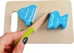 Opdelte frugter, grøntsager og fisk “skæres” nemt med den trækniv takket være velcro og sættes sammen igen. En fantastisk træning af finmotorik og rolleleg.