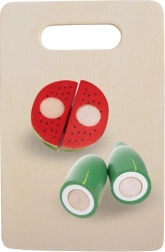 Der medfølger en kasse til overskuelig opbevaring, 2 træknive, et skærebræt og en imitation af en skræller. Sættet udvikler finmotorik, hånd-øje-koordination, kreativitet samt samarbejde ved fælles leg. Perfekt til børnekøkken, børnehave og rejser.