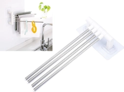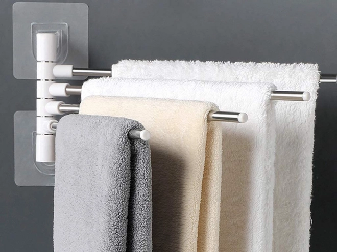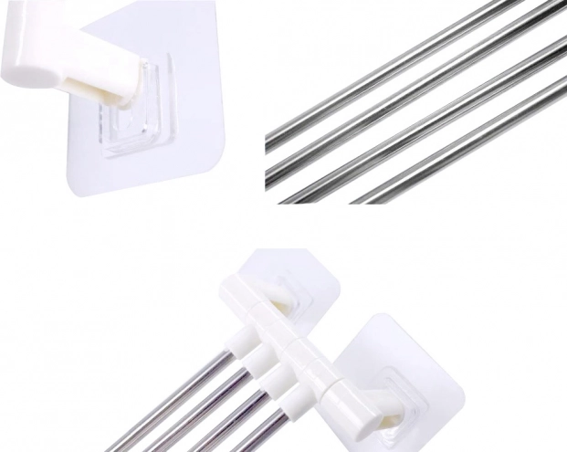 Monteringen er hurtig og ren – uden boring. Den stærke selvklæbende flade holder på glatte overflader, så du ikke beskadiger fliserne. Ideel til badeværelse, køkken eller vaskerum, hvor du vil have pladsbesparelse og nem adgang til håndklæder.