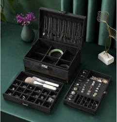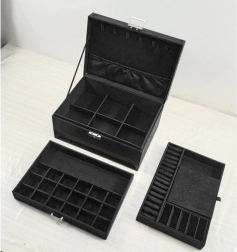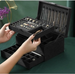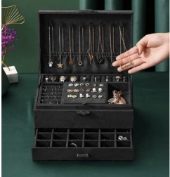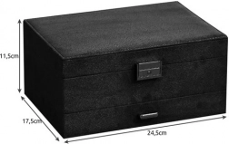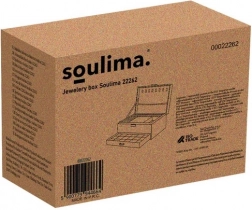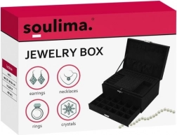 Stilfuldt og praktisk smykkeskrin SOULIMA i elegant sort farve sikrer perfekt overskuelig opbevaring af smykker både hjemme og på farten. Det har flere niveauer og forskellige rum til ringe, øreringe, halskæder, armbånd og ure, lås med nøgle for højere sikkerhed samt en blød, fløjlsagtig overflade, der beskytter mod ridser og støv.
