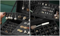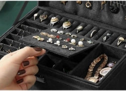 Indvendig inddeling i flere niveauer: kroge til kæder, pladser til ringe og øreringe, både store og smalle rum samt en skuffe. Alt har sin plads og er lige ved hånden.