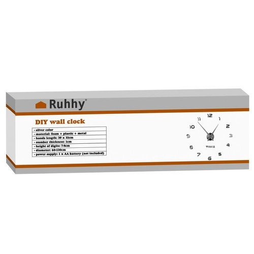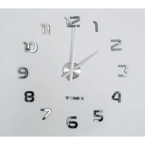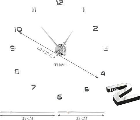 Moderne vægur til selvmontering med justerbar diameter 60–130 cm, der pynter i enhver indretning. Skinnende sølvfarvede 3D-tal med spejleffekt skaber et elegant design, og den stille, glidende gang uden tikken sikrer ro i både stue og soveværelse. Takket være den medfølgende skabelon og selvklæbende tal er monteringen hurtig og nem. Drives af 1× AA-batteri (medfølger ikke).