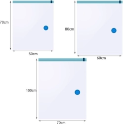 Vi præsenterer et universelt og praktisk sæt vakuum opbevaringsposer til både opbevaring derhjemme og på rejser. Disse poser vil hjælpe dig med at organisere din plads ved at reducere volumen af opbevarede ting med op til 80%. De kan bruges igen og igen og giver høj beskyttelse mod støv, fugt og møl.