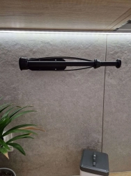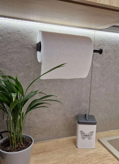 Minimer rod på køkkenbordet med den sorte papirhåndklædeholder. Dens drejemekanisme sikrer, at papirhåndklæder altid er inden for rækkevidde. Rotationslås forhindrer uønsket rotation af rullen, hvilket muliggør let frisætning af et enkelt stykke. Holderen kan monteres på væg eller skab, horisontalt eller vertikalt, enten ved skruning eller fastgørelse med 3M tape.
